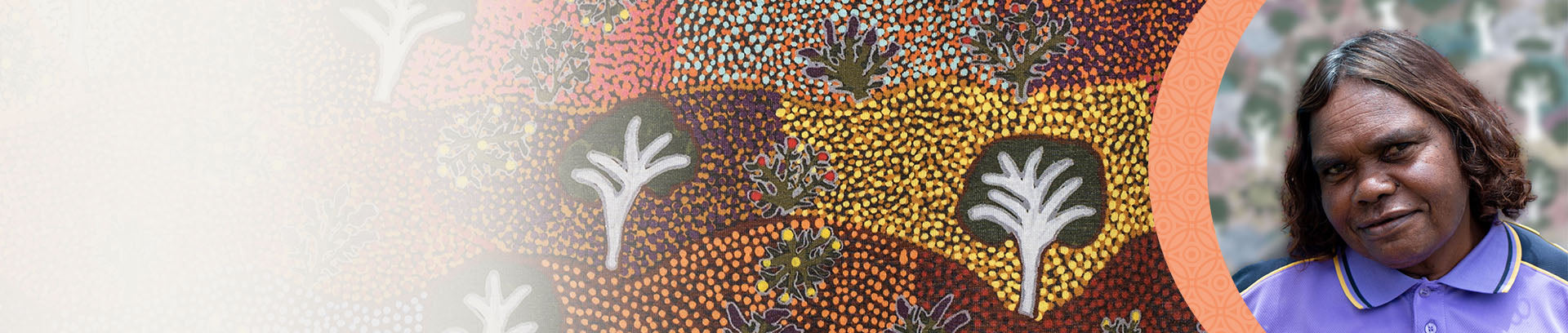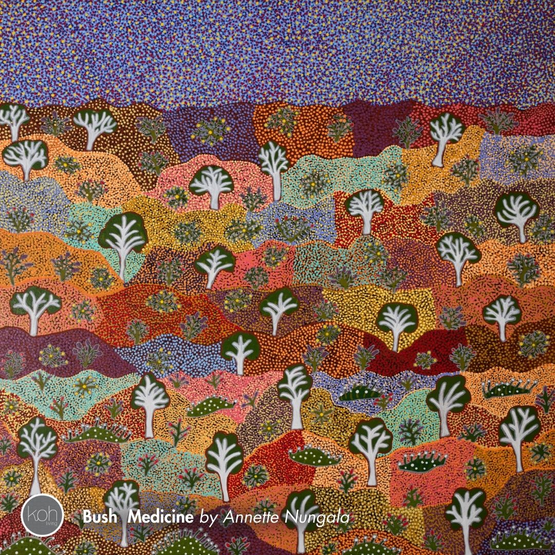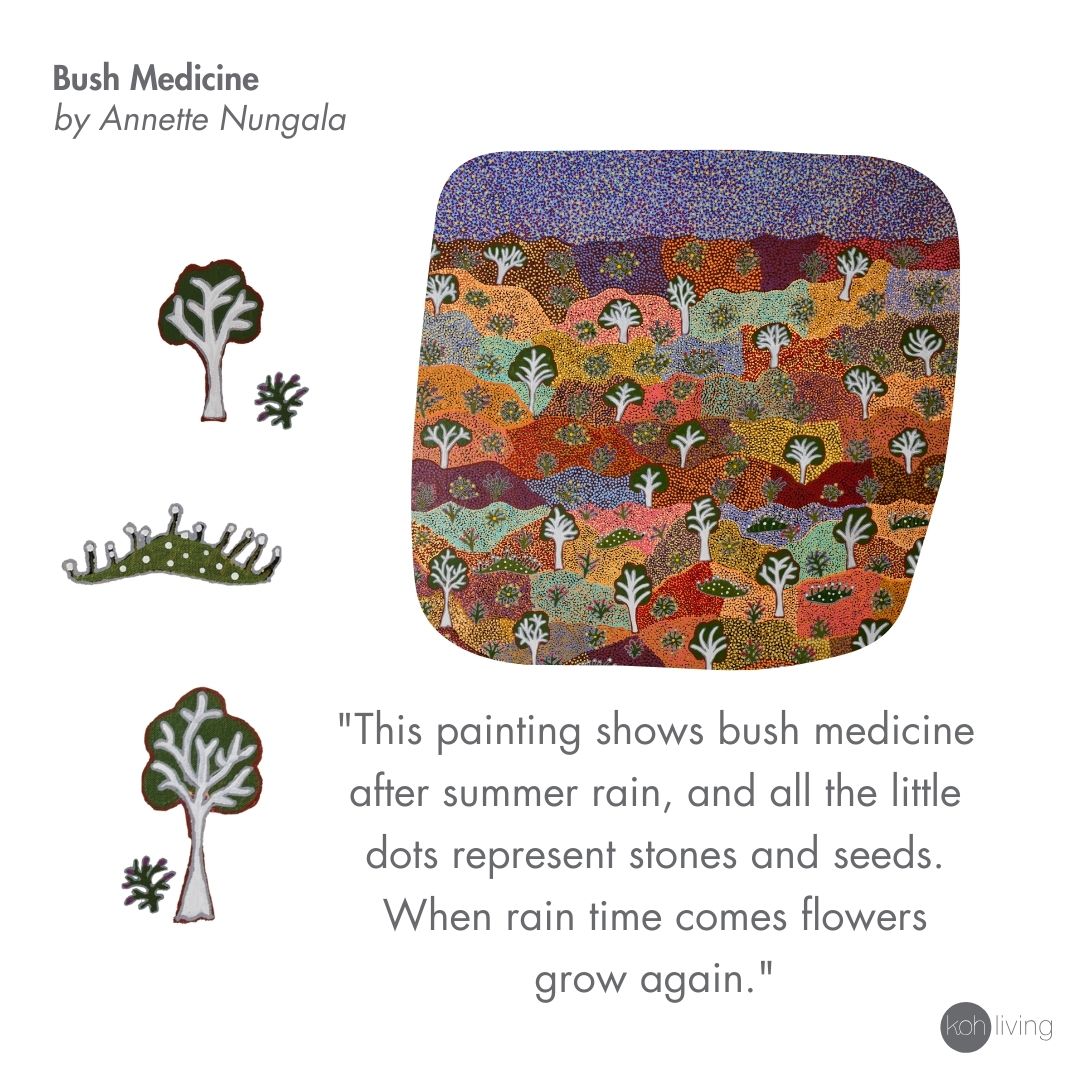 “This painting shows bush medicine after summer rain, and all the little dots represent stones and seeds. When rain time comes flowers grow again. Bush Medicine is a subject Annette Nungala Peterson returns to repeatedly in her painting, knowledge of bush medicine is taken very seriously in Indigenous culture and is often held by women. The science of bush medicine involves relationship with the Country, family, and a healthy way of life inherited by ancestors.