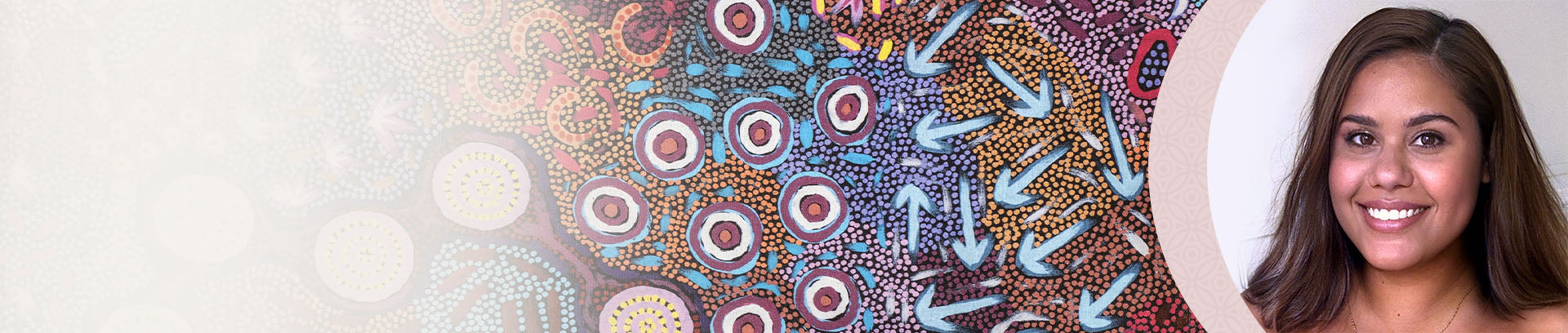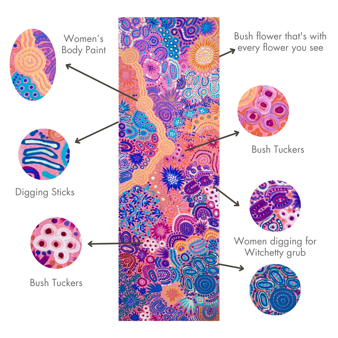 The Women’s Dreaming paintings by Khatija depicts Women’s ceremonial sites surrounding Tjukurla in the western desert of Central Australia – traditional homelands to the artist’s great grandmother. Ceremonial sites carry a deep spiritual meaning, and it is where the women narrate their sacred Aboriginal dreamtime stories, through song lines, dance cycles and body paint. This painting has many secret and sacred landmarks and iconography but also includes the important fire, bush tucker and waterholes that are imperative to the women as the ceremonies can last for over a week. Though primarily a landscape painting Khatija has surpassed the basic stories and landmarks and has expanded this art of body painting and ceremonial themes into a classic contemporary composition, using modern acrylic paints.