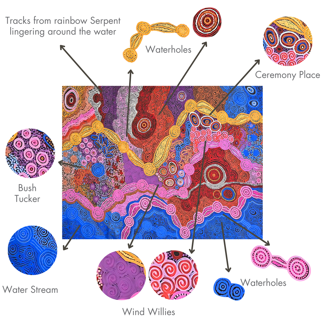 In this Dreaming story from Pupunya, NT, the Rainbow Serpent is the mighty creator who carved the land, shaping valleys, rivers, and of course, the sacred waterholes! As she slithered through the red earth, her body left behind the winding paths of rivers and the pools of water that sustain life. The waterhole is her resting place, a sacred mirror reflecting her rainbow colors when the sun hits just right. She’s both protector and giver, bringing water and life but also warning that the land must be respected. The Mimi spirits dance around her, sometimes stirring trouble, reminding all who come near to honor the balance between creation and chaos, but to always to respect the water holes and to never trouble them. So, the Rainbow Serpent is the cosmic painter sketching with constellations and water, weaving the land’s story into the stars above and the water below. It’s like floating in space, where every ripple and color tells a story of life’s endless flow leaving behind it’s natural beauty of bright colours into the water holes.