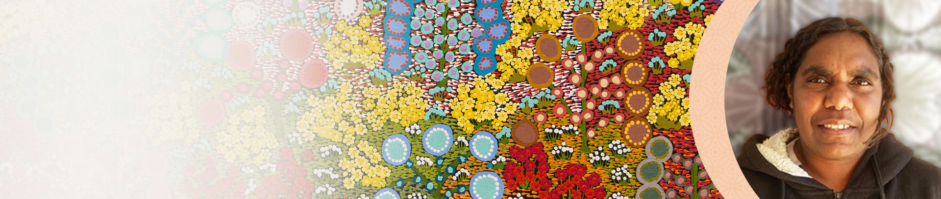 Pammy's most recent artwork "Wildflowers" captures the vivid yellow flowers that blanket her country around Karlu Karlu during winter, a sight of natural wonder.